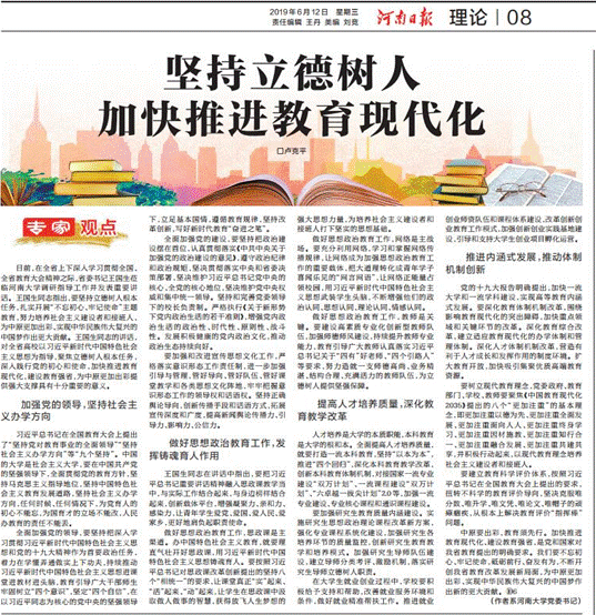 日前,在全省上下深入学习贯彻全国、全省教育大会精神之际,省委书记王国生莅临河南大学调研指导工作并发表重要讲话。王国生同志指出,要坚持立德树人根本任务,扎实开展“不忘初心、牢记使命”主题教育,努力培养社会主义建设者和接班人,为中原更加出彩、实现中华民族伟大复兴的中国梦作出更大贡献。王国生同志的讲话,对全省高校以习近平新时代中国特色社会主义思想为指导,聚焦立德树人根本任务,深入践行党的初心和使命,加快推进教育现代化,建设教育强省,为中原更加出彩提供强大支撑具有十分重要的意义。