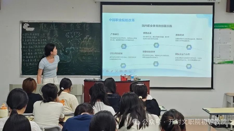 班会伊始,各主讲人借助精心制作的PPT向同学们介绍新时代职业教育的发展现状和趋势,并说明职业教育在社会发展中的重要作用,让同学们明白职业教育是实现个人价值和社会价值的重要途径。接着,通过短视频,结合实际案例,向同学们展示默默耕耘的大国工匠,讲解了扎根教学一线的教师事迹,让同学们直观感受到职业精神的魅力和力量。然后,又通过小组讨论的形式,围绕“作为师范生,如何培养与专业相匹配的教师职业精神”这一话题展开讨论,加深同学们对职业精神的理解。最后,各班辅导员走进班团会,总结了此次班团会的主要内容,并且又着重向同学们强调师范生培养教师职业精神的重要性,建议同学们在今后的学习中,可以通过训练教学基本功、参与教育实践等,将教师职业精神融入到每一个学习环节,努力提升自己的专业技能和职业素养,为未来的教师职业发展奠定坚实基础。