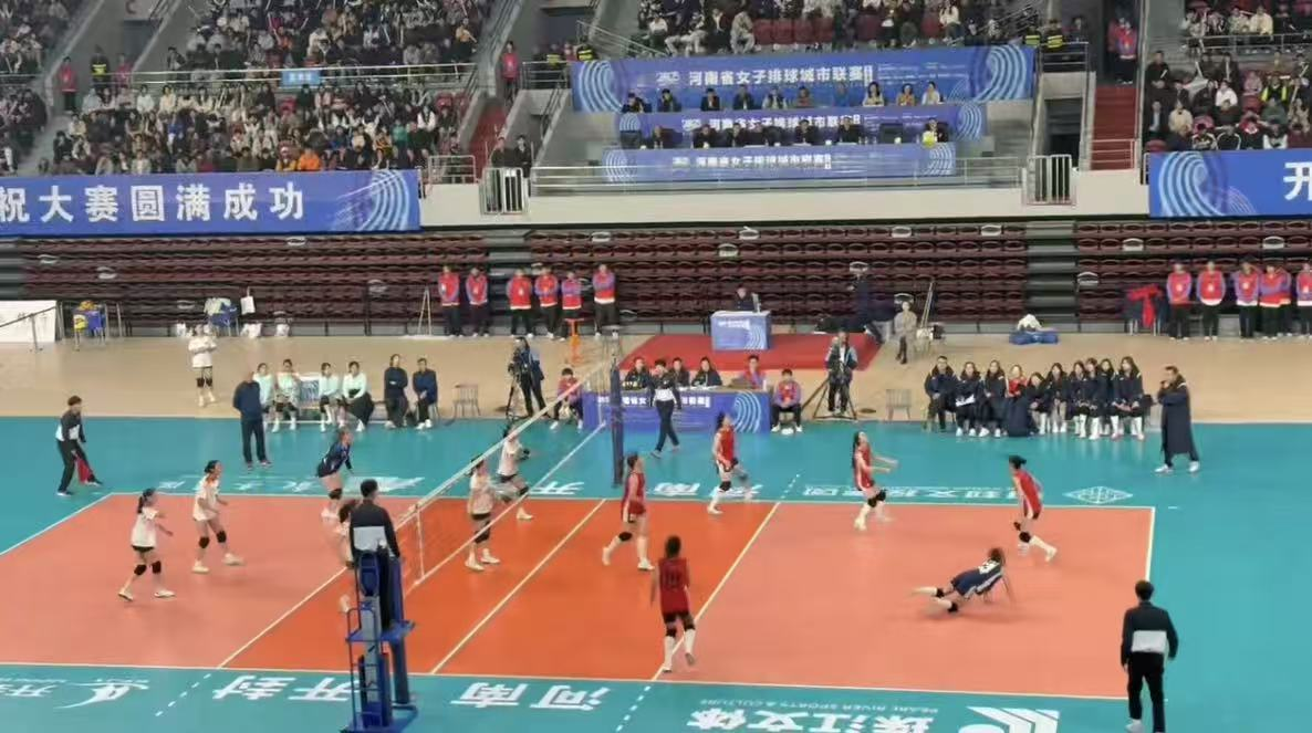 本场比赛由开封龙亭队对阵周口队,比赛现场气氛热烈,双方队员全力以赴,扣杀、拦网、扑救,每个精彩瞬间都引来观众阵阵掌声与呐喊。整场比赛高潮迭起,运动员们顽强拼搏、永不言弃的精神深深感染了在场学子。