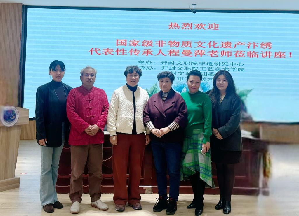 为深入贯彻习近平总书记关于非物质文化遗产保护的重要指示精神,推动国家级非物质文化遗产汴绣项目的传承与创新,10月29日下午,校非遗研究中心主办了一场主题鲜明、内容丰富的汴绣文化讲座。特邀中国刺绣艺术大师、国家级代表性传承人程曼萍老师莅临本校,开展题为——“扬工匠精神,勇担传承汴绣技艺的重任”专题讲座。校非遗研究中心主任祁颖、校团委组织部部长张盼乐、工艺美术学院教研室主任刘斌、开封市工艺美术学会秘书长刘新丽、汤氏古琴项目市级代表性传承人汤红伟及我校师生共170余人参加活动。讲座由非遗研究中心伊璐瑶主持。