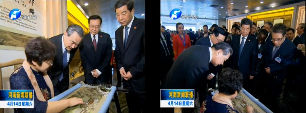 同时,程曼萍老师在针法技艺上极为全面,能绣制单面绣、双面绣、双面异色绣、双面三异绣以及人物肖像等多种类型的刺绣作品。她大胆创新,独创了“席篾绣”“叠彩绣”等针法,并逐步形成了自己独到的刺绣艺术风格。她的作品多次在全国工艺美术百花奖展评中荣获金银奖,为中国刺绣艺术赢得了国际声誉。她多次参与到《文莱国王肖像》、《马来西亚总理∙马哈迪尔夫妇》、《邓小平肖像》、《刘少奇肖像》等汴绣作品的制作中,为中国刺绣行业奉献了自己的力量。她特别提到,汴绣作品曾多次为人民大会堂、驻外使领馆等重要场所定制,彰显了其深厚的文化价值与国家认可。
