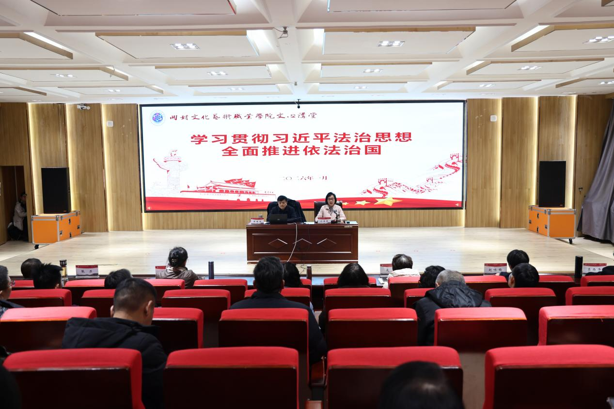 为系统深入学习贯彻习近平法治思想,切实提升依法办学治校能力,1月7日,我校邀请开封市委组织部副部长、河南大学特聘教授、法学硕士研究生导师陈培鸿作习近平法治思想专题报告。校党委领导班子成员、各部门中层副职以上干部、马克思主义学院全体教师、青马班学生代表等200余人参加。市人大常委会副主任、校党委书记沈洁霞主持报告会。