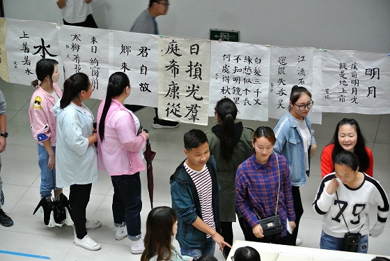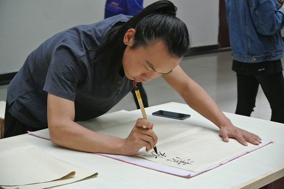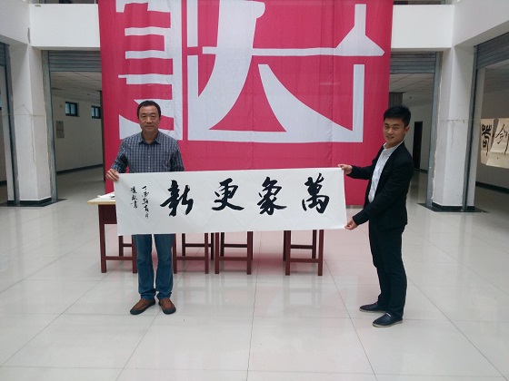 活动期间,师生纷纷拿起毛笔,谦沉着有力地书写,每个字都苍劲有力。老师指点学生、学生认真书写,体验并感受书画的神韵。李双林书“天道酬勤、万象更新”八个大字跃然纸上,并鼓励同学们,只要肯付出努力,就会有收获。孙龙超送给少数民族同学们“扎西德勒”四个字,表示欢迎到河南开封学习。贺思谦写下篆书“宁静致远”告诫同学们要平稳静谧心态,不为杂念所左右,静思反省,才能实现远大的目标。