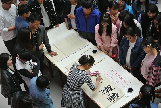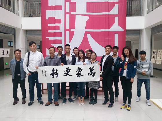 5月3日下午4点30分,工美系全体师生在艺术楼一楼展开了全民书法活动,工艺美术系主任李双林,副主任孙龙超、常学颖、系团总支书记谢世贤,辅导员贺思谦、张春阳、刘佳及全系百余名学生参加了本次活动。活动期间,师生纷纷拿起毛笔,谦沉着有力地书写,每个字都苍劲有力。老师指点学生、学生认真书写,体验并感受书画的神韵。李双林书“天道酬勤、万象更新”八个大字跃然纸上,并鼓励同学们,只要肯付出努力,就会有收获。孙龙超送给少数民族同学们“扎西德勒”四个字,表示欢迎到河南开封学习。贺思谦写下篆书“宁静致远”告诫同学们要平稳静谧心态,不为杂念所左右,静思反省,才能实现远大的目标。