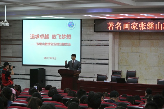 张继山在讲座中,通过简要介绍自己近四十年的学习和生活经历,由一个山区放牛娃到成就不凡的画家。张继山凭着"俯首甘为孺子牛"的执着信念对绘画事业倾注全部热情,同时也在公益事业上倾尽全力。张继山秉承"捧着一颗心来,不带半颗草去"的态度,以阳光的心态投身于创业、公益事业中,就如他作品中空灵和纯洁的意境,鼓舞学生提升自我艺术价值、提高艺术创新。