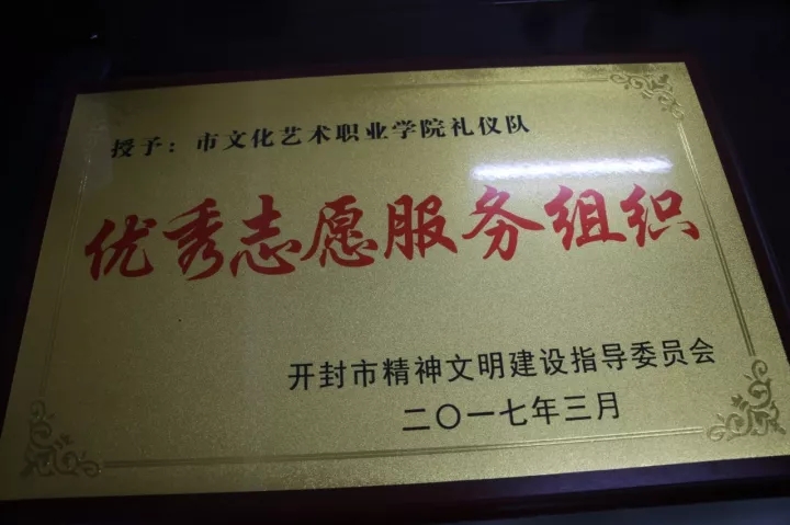 10月29日,开封市精神文明建设指导委员会正式向学院礼仪队颁发了优秀志愿服务组织奖奖牌。礼仪队员用自己辛劳与努力的工作赢得了学院和社会的肯定,彰显了青春风采。