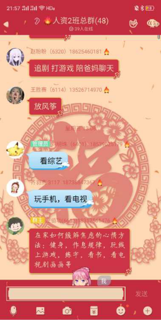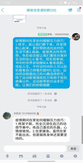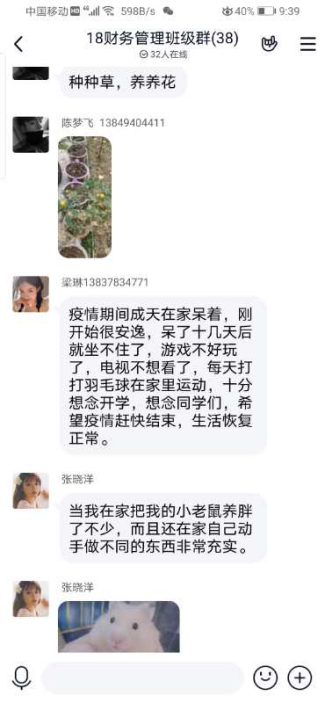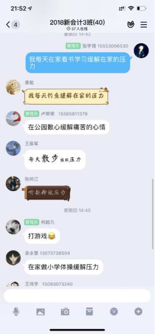 同学们通过班团会平台纷纷讲述了自己特殊时期的宅家生活:或者通过健身运动增强体质,舒缓心情;或者通过练字画画、读书学习、练习乐器、种植花草等方式寻找快乐,享受生活;又或者通过专业学习与休闲娱乐张弛有度、简单有序的居家生活方式放松自我、提高自我。大家积极交流,讨论的热火朝天,同学们在特殊时期做好健康防护的同时,以自己不同的调节方式规律作息、充实自己、愉悦心情,保持乐观向上的健康心态和生活热情,积极适应生活节奏,享受阳光快乐的生活,坚持对美好生活追求和抗疫胜利的信心与期望。最后各班团支书又向各位同学介绍了一些情绪调节的方法和技巧,如:表情体验的情感调节、沟通交流的人际调节、深入自然放松心情的环境调节、改变认知、转换角度的认知调节、心理暗示、转移注意力的情绪调节等,帮助大家共同科学抗疫,快乐抗疫。