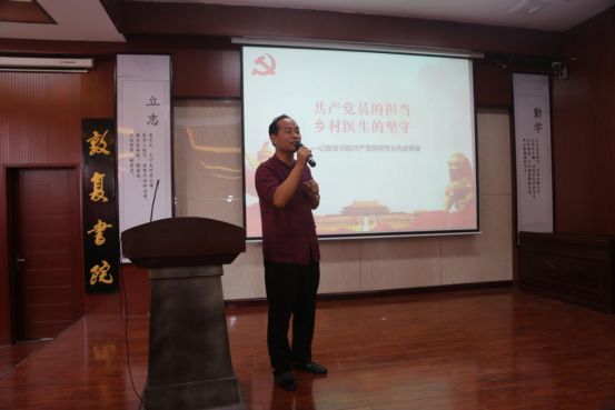 “N”项活动由敦复书院党支部党员、全国五一劳动奖章获得者开封市道德模范何传义为大家做题为《乡村医生的职责,共产党员的担当》的报告。2020年农历春节,新冠肺炎疫情发生。作为鼓楼区政协委员、一名乡村医生,何传义毅然加入全民抗疫队伍中,义无反顾地冲在最前线。他用金银花、黄芪、炒白术、藿香、防风、艾叶等熬制成抗“疫”扶正中药液,免费送给抗击新冠肺炎疫情一线工作人员,提高大家的免疫力。在抗疫的日日夜夜,何传义连续工作30多天,先后投入20万元资金,熬制了5万多袋抗“疫”扶正中药免费送给了抗疫一线工作人员。何医生的报告感染了在场的每一名党员,报告结束后大家对何医生报以热烈的掌声。