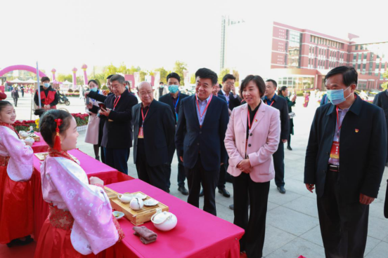 开幕式前在我校校园内举行的开封市社区教育成果展成为当天活动中独具开封特色的亮点,共有18个非遗项目和20所中小学和中职、高职学校参展。汴绣、二夹弦、木版年画、宋室风筝等非遗项目传承人现场演示,充分展示了非遗项目的精湛技艺与丰厚文化底蕴;职业院校也组织师生展示插花、茶艺、面点烘焙、服装制作、牙科诊疗等特色技能教育项目,尽展职教魅力。