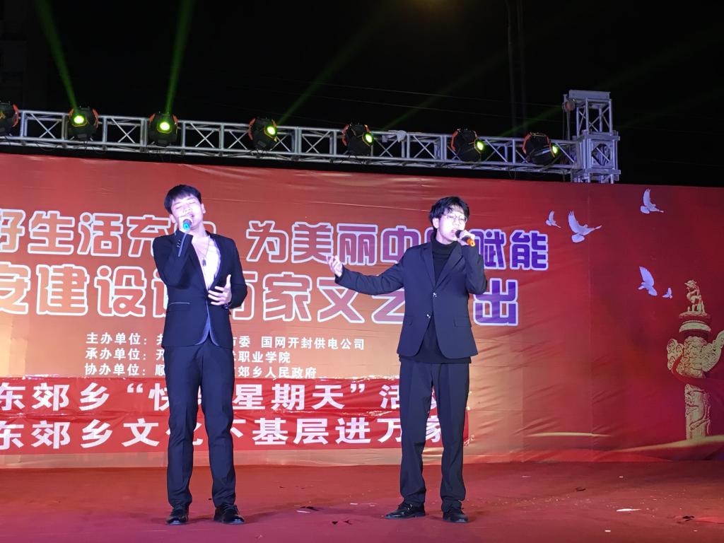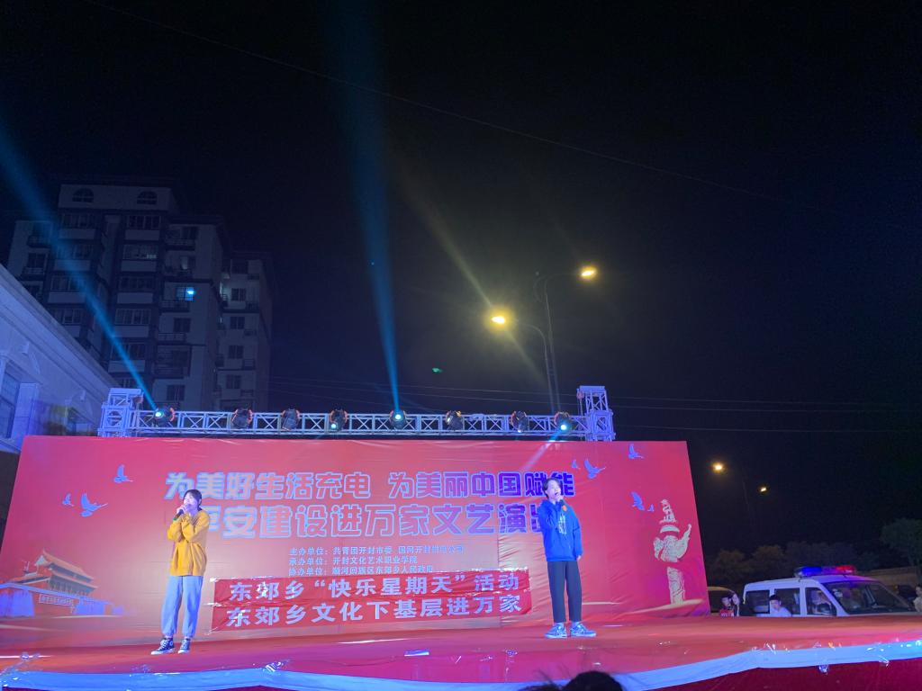 2020年11月15日,由共青团开封市委主办,开封文化艺术职业学院承办的“为美好生活充电,为美丽中国赋能”平安建设进万家文艺演出活动在东郊乡清水河社区举行,音乐学院承担了整台文艺汇演中《跟着你到天边》,《嘉陵江上》,《夜空中最亮的星》等节目。