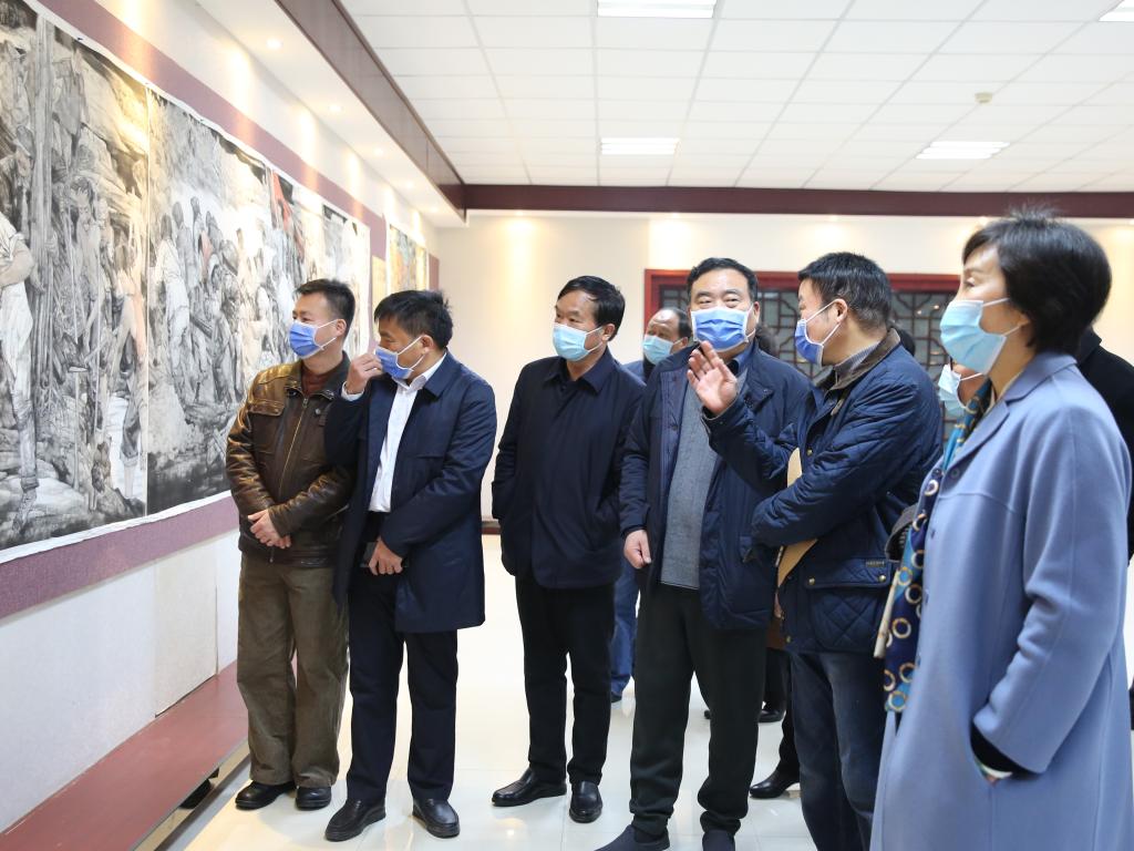 1月25日上午,冬阳杲杲,云霁天蓝,市政协主席焦跃进一行莅临我校,观摩学校“唱响黄河文化,弘扬焦裕禄精神”系列组画。市政协副主席、民盟市委主委刘海潮,学校党委书记任洪河、校长沈洁霞,市政协研究室副主任、政协书画院院长郭欣,河南省美协副主席袁汝波,市美协主席刘艳会,市美术馆馆长、美协副主席魏吉安陪同观摩,学校党委班子成员,相关部门负责人参加观摩会。