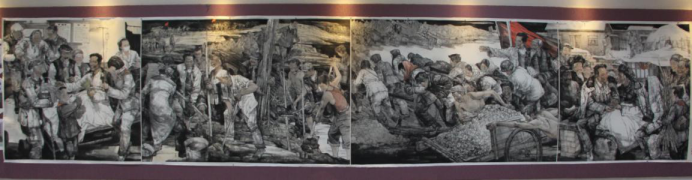 为弘扬焦裕禄精神,庆祝中国共产党成立100周年,学校党委高屋建瓴,及早谋划,坚持“四个自信”,突出学校文化艺术特色,开展形式多样的庆祝活动。工艺美术学院副教授孙龙超情系故土,深情缅怀焦裕禄同志,潜心构思作画8个多月,创作了展现焦裕禄精神系列组画。 此幅作品为中国水墨人物画,长7.64米,高1.5米,分4个篇章展现了焦裕禄在兰考工作、生活的历程。作品从“初到兰考、体验兰考、奉献兰考、流芳兰考”等四个方面,全面彰显了"亲民爱民、艰苦奋斗、科学求实、迎难而上、无私奉献"的焦裕禄精神。