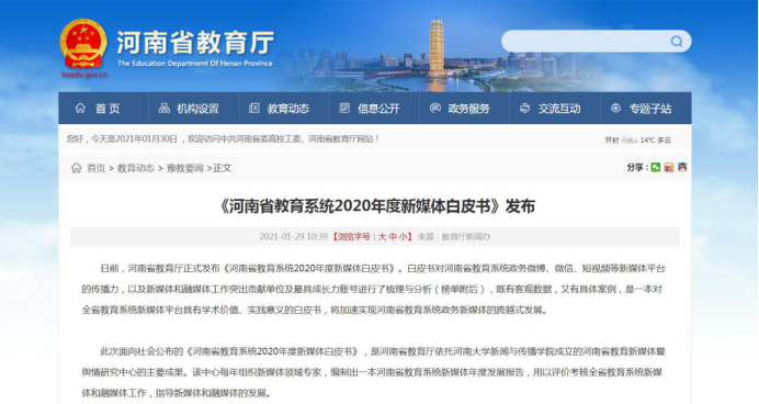 白皮书对河南省教育系统政务微博、微信、短视频等新媒体平台的传播力,以及新媒体和融媒体工作突出贡献单位及最具成长力账号进行了梳理与分析既有客观数据,又有具体案例,是一本对全省教育系统新媒体平台具有学术价值、实践意义的白皮书。