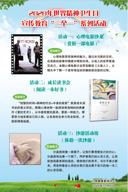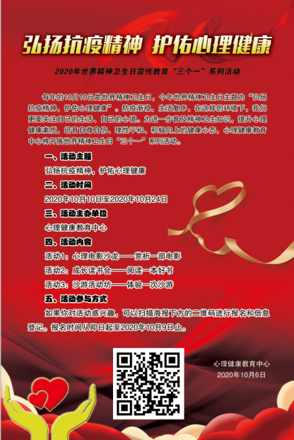 每年的10月10日是世界精神卫生日,今年世界精神卫生日主题为“弘扬抗疫精神,护佑心理健康”。防疫渐稳,生活复序,在这样的环境下,我们更要关注自己的生活、自己的心境。为进一步普及精神卫生知识,提升心理健康素质,培育自尊自信、理性平和、积极向上的健康心态,将开展世界精神卫生日“三个一”系列活动。