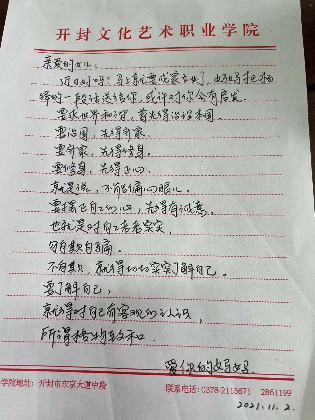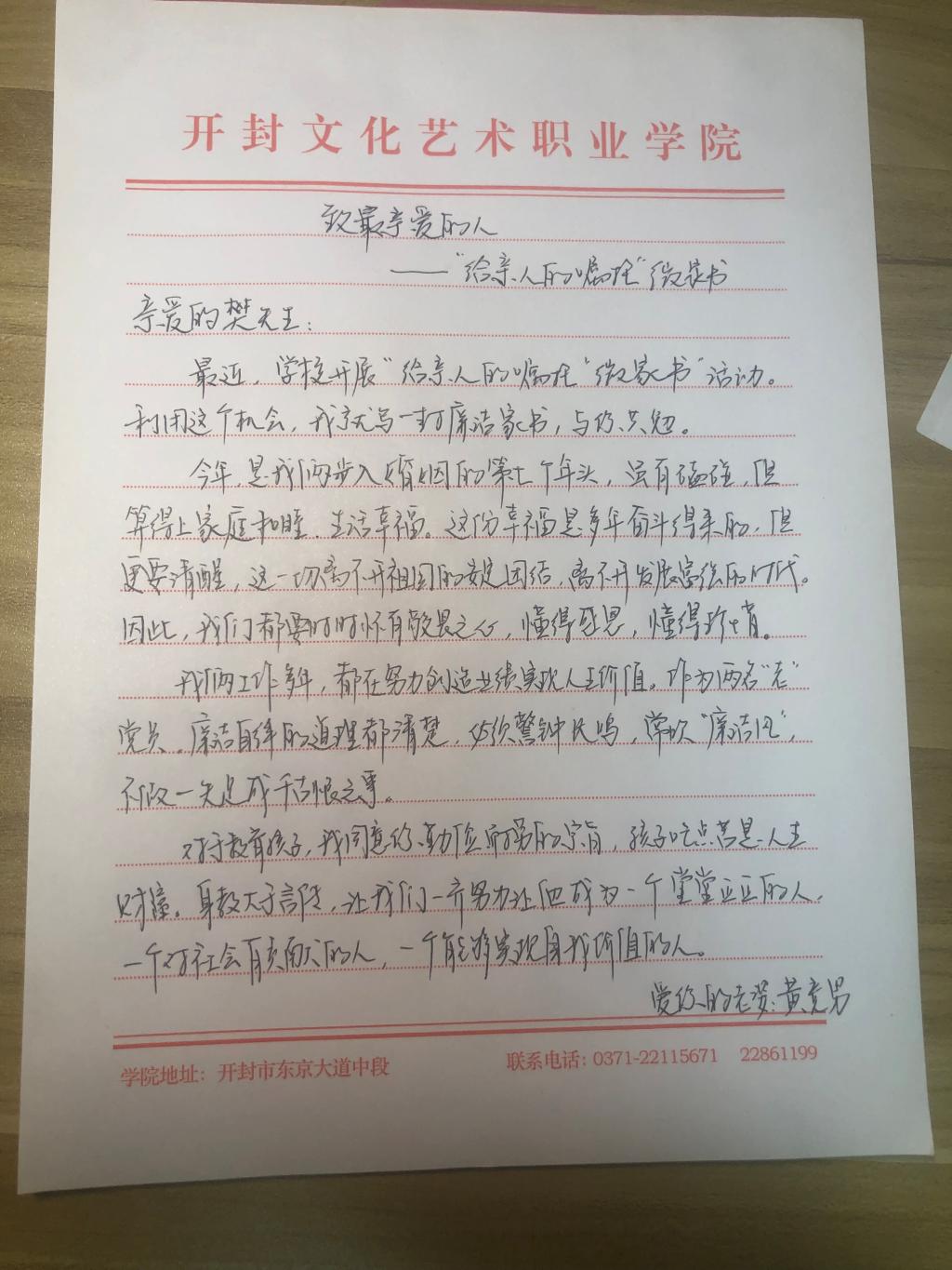 为深入贯彻落实习近平总书记关于“注重家庭、注重家教、注重家风”系列重要指示精神,大力推进清廉家风建设,开封文化艺术职业学院纪委开展了“给亲人的嘱托”微家书活动。