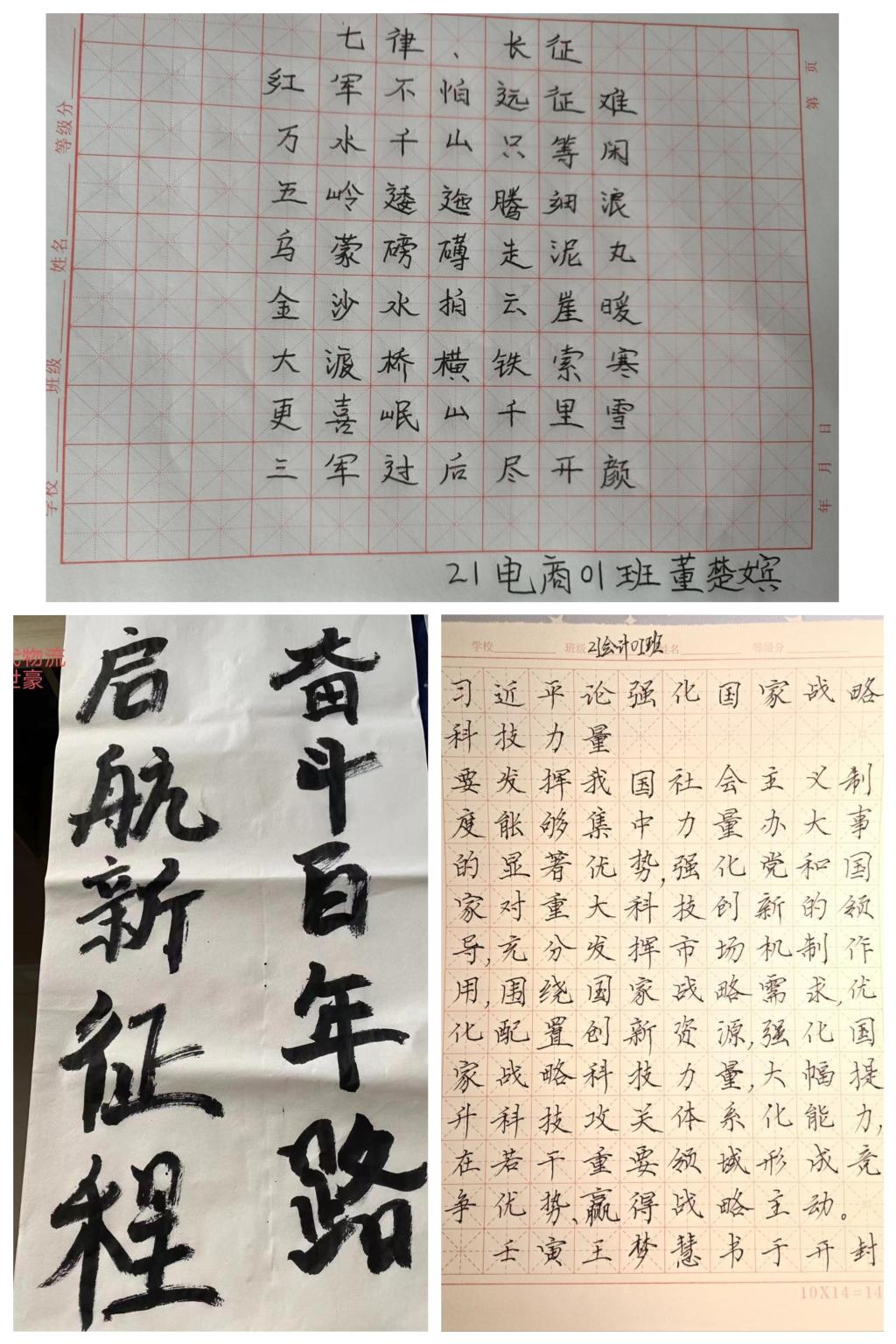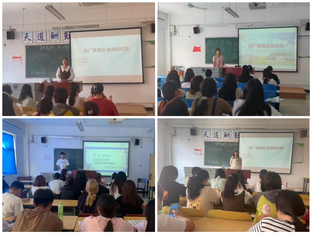 在各班组织召开的主题班会上,一方面向同学们阐述“推普”工作的重要性,另一方面结合“推普”进行爱国主义教育,激发广大师生学习普通话、推广普通话的积极性和自觉性,使普通话成为校园语言。在经典诗文朗诵和汉字书写活动中,围绕“推广普通话,奋进新征程”主题,师生们通过诵读经典作品和书写红色诗词的形式,践行说普通话、写规范字,不断加强和提高自己的语言文字素质和人文修养。
