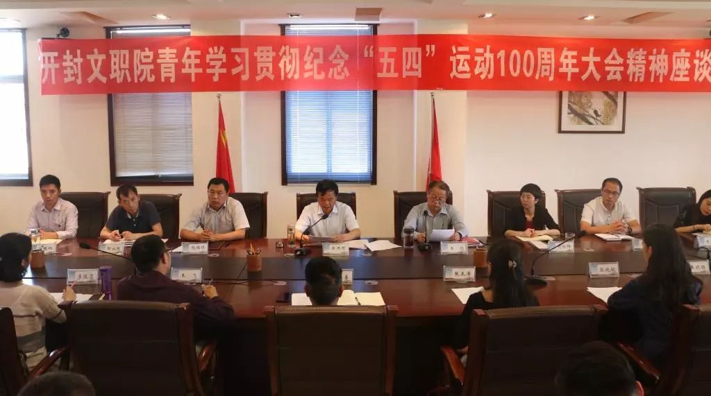 为深入学习贯彻习近平总书记4月30日在纪念五四运动100周年大会上的重要讲话精神,激励广大青年发扬五四精神,弘扬爱国情怀,激荡青春力量,5月22日,开封文化艺术职业学院青年学习贯彻纪念“五四”运动100周年大会精神座谈会于我校办公楼301会议室召开。校党委书记任洪河、党委副书记王凯出席会议。党办主任院继恒、组宣部部长刘咏梅、学生处副处长靳永彬、全校青年教师代表、学生代表、2018年度“两红两优”代表、开封市青年岗位能手代表和团干约50余人参加会议。