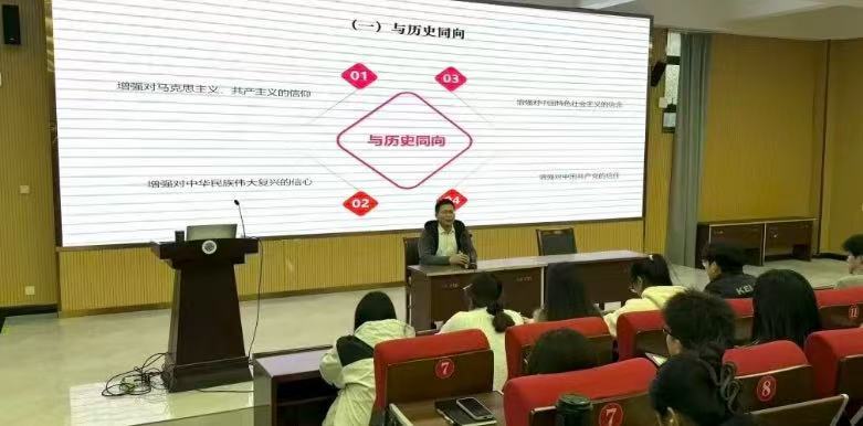 在《传承红色基因 争做时代新人》主题分享中,王伟副教授聚焦开封红色文化的四种形态,从《中州评论》《心声》等红色文献,到开封女中救国会请愿、大中学生卧轨请愿等红色事迹,再到李大钊、焦裕禄等红色人物,全方位展现了开封红色文化所蕴含的理想信念与家国情怀。他结合自身抗疫期间坚守校园、为学生送餐的亲身经历,阐释了红色文化中“亲民爱民、艰苦奋斗、无私奉献”的精神内核在新时代的传承与发展。针对青年学子特点,王伟强调,新时代青年要做到“与历史同向、与祖国同行、与人民同在”,既要从《沉默的荣耀》等红色文艺作品中汲取信仰力量,也要在志愿服务、社会实践中践行雷锋精神,将红色基因转化为成长动力。