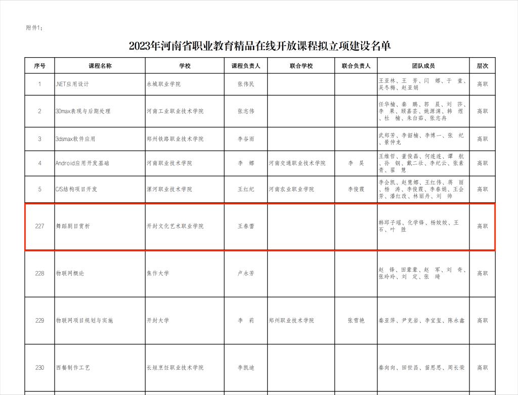 近日,河南省教育厅公布了《2023年河南省职业教育精品在线开放课程拟立项建设名单》,我院王春蕾老师主持的《舞蹈剧目赏析》精品在线开放课程成功立项。